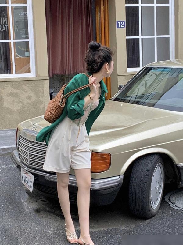 推荐look↓绿色衬衫+高腰黑色裤子,演绎出高级感
