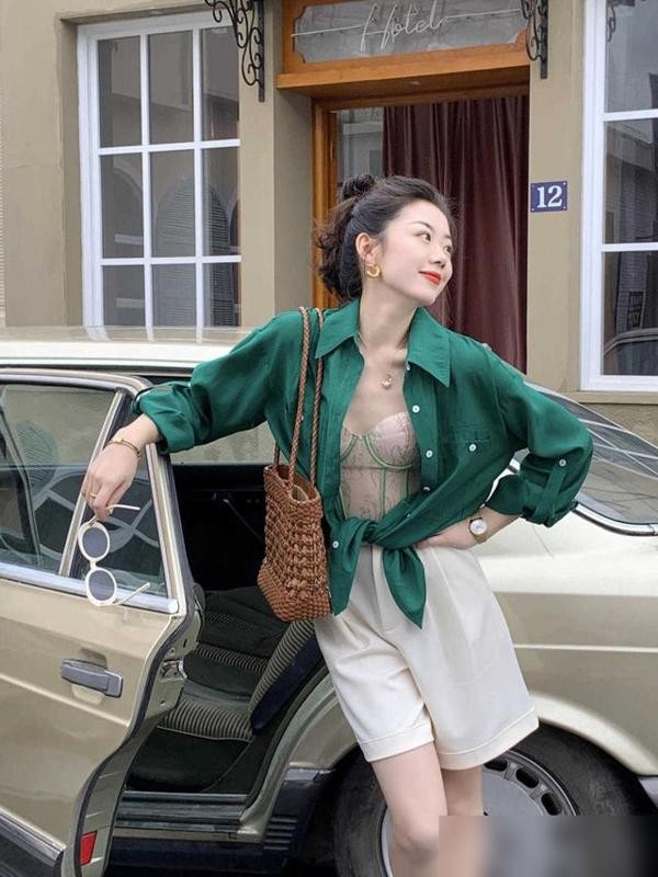 想要提升氛围感,可以在衬衫里面搭配小可爱,这样不仅能展现出层次感,还能增添几分性感魅力。