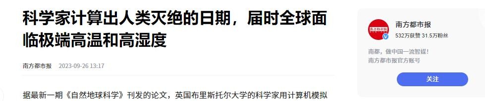 然而就在2023年9月25日,英国科学家在《自然地球科学》上发表了人类灭亡的时间,甚至就连灭亡的原因也清清楚楚写上了。