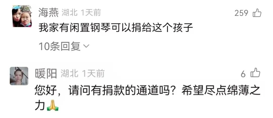 @海燕:我家有闲置钢琴可以捐给这个孩子。