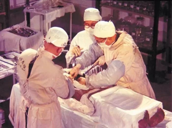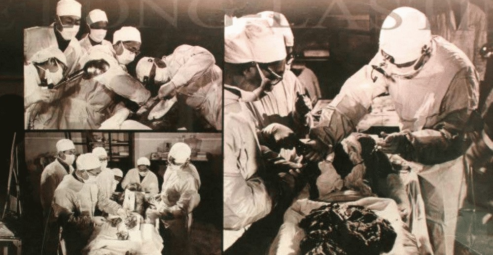 为了将尸体与裹尸布分离,考古学家不得不用手术刀将辛追夫人脸部的丝绸割开。
