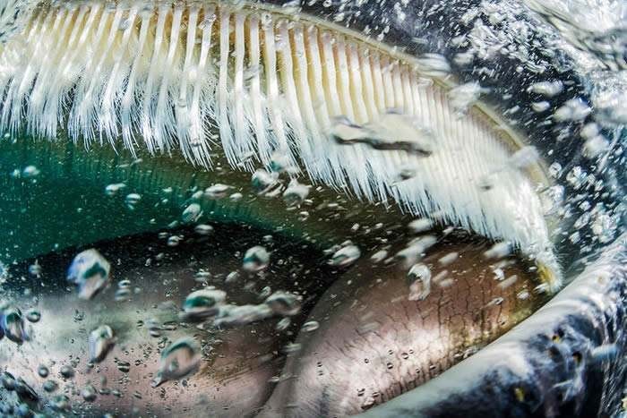 然而蓝鲸的口中并没有牙齿,而是具有一排排250~300 根长长的、毛发状的鲸须,蓝鲸的鲸须柔韧,上面还长着许多须毛。蓝鲸在进食的时候,会一后吞下几十吨磷虾和海水,在此时鲸须用来将水滤出口外, 把食物剩在口中。这样的进食过程,省去了用牙齿咀嚼食物的过程,大大增加蓝鲸的进食效率,这也是蓝鲸能成长得这么大的原因之一。