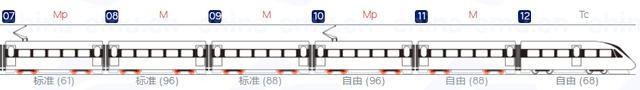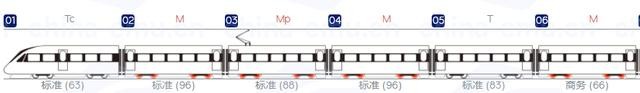 车辆编组为12节,为9动3拖的12辆编组形式,头车01车、中间05车、尾部12车为拖车厢,其余为动车。每列设商务车厢1节,定员66人,设标准车厢11节,定员923人。