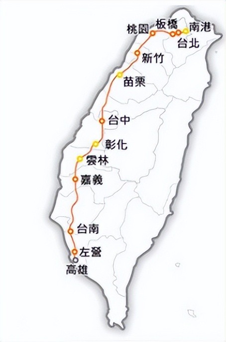 台湾高铁仅一条线路,坐落的宝岛西侧,自北向南,北起南岗站,经过台北站、板桥站、桃园站、新竹站、苗栗站、台中站、彰化站、云林站、嘉义站、台南站,止于左营站。全长约350km.