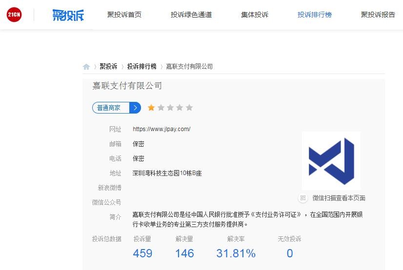 近日,21聚投诉、黑猫投诉等第三方投诉平台上出现了许多关于嘉联支付分润无法提现的投诉,金额从99元到60万元不等,多名POS机代理商四处投诉,期望追回分润。