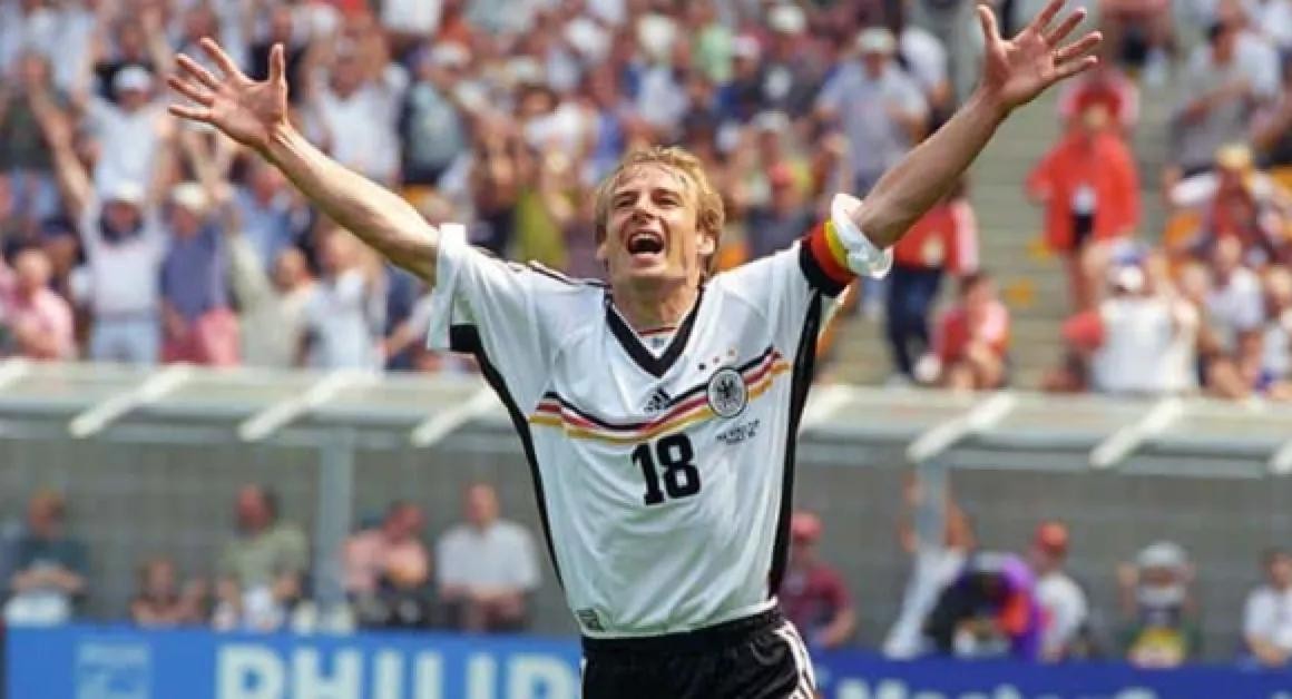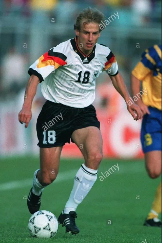 在克林斯曼踢球的年代,他总共在世界杯上打进了11个进球!前面只有远古大神穆勒,方丹和贝利,这是个非常骄傲的成绩了!因为他同时代有很多非常有实力的前锋,但是只有克林斯曼能在大舞台稳定发挥!