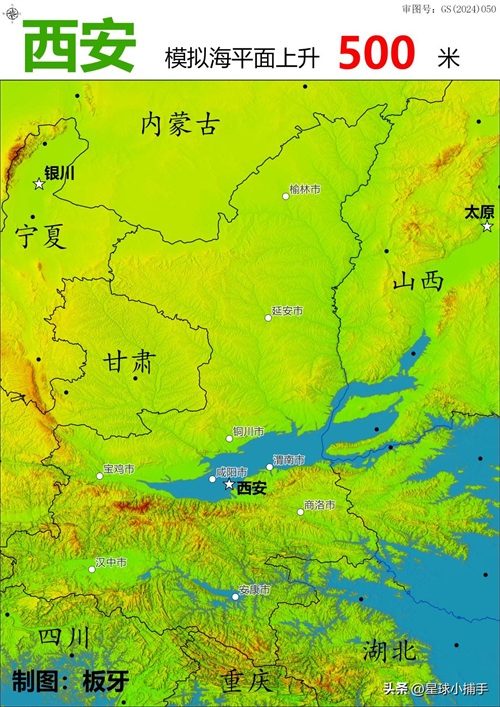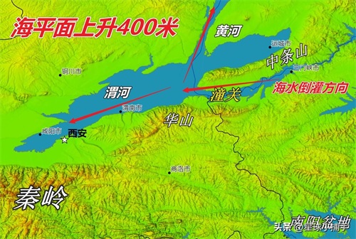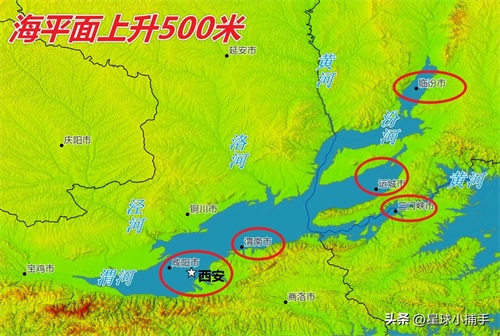 首先,观察这张海平面上升500米的图。可以看到海水从黄河倒灌进入了关中盆地。