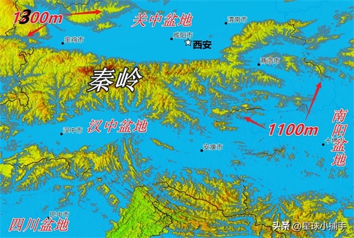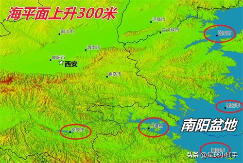 海平面上升300米,海水淹没了 南阳盆地(图中右下角),南阳盆地位于秦岭、大巴山以东,桐柏山、大别山以西,其北是秦岭山脉的东端,其南是大巴山脉的东端。周边的山脉恰好把这块地方给围了起来,从而形成了盆地。