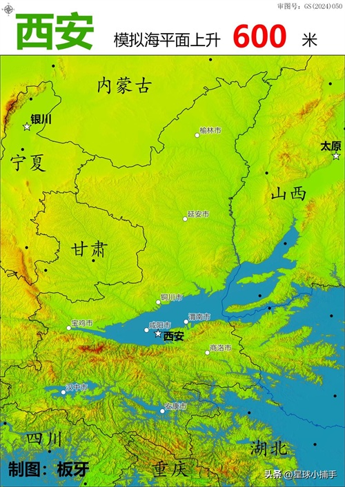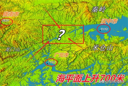 模拟海平面上升600米,此时四川盆地也已经被淹没,海水沿着嘉陵江倒灌,淹没广元市;汉江的海水将汉中盆地淹没;另一股海水沿着渭河淹没宝鸡市。