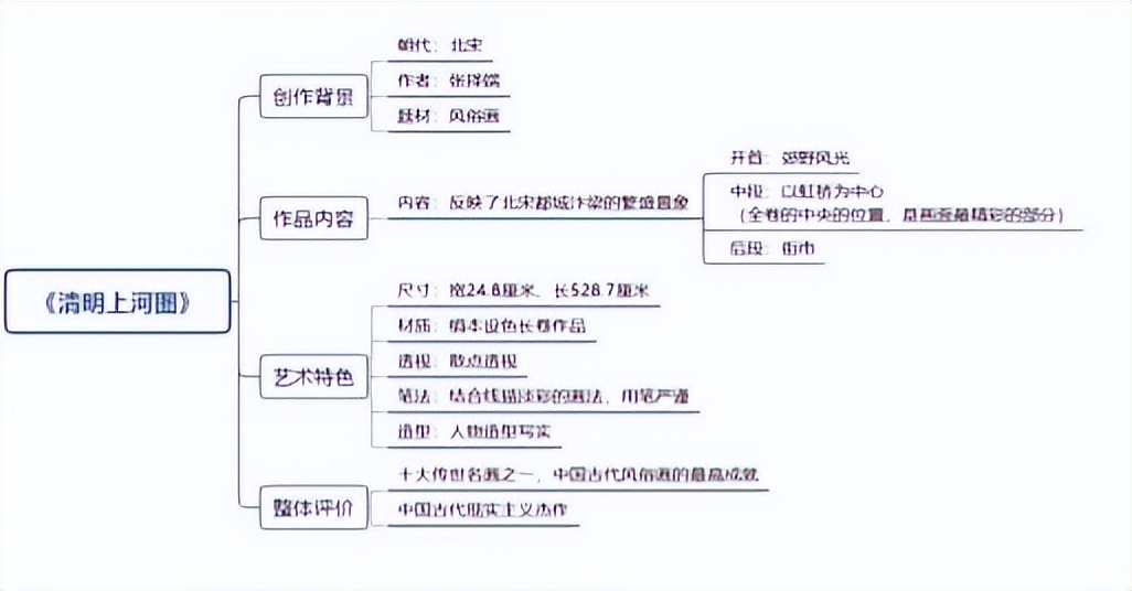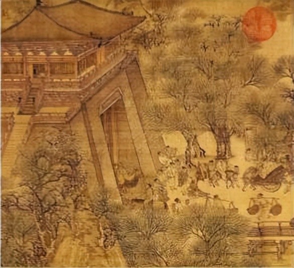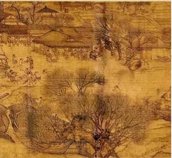 画面分为郊野、汴河、街市三个段落。首段疏林薄雾,掩映着几家茅舍、草桥、流水、老树、扁舟。两个脚夫赶着五匹驮炭的毛驴,向城市走来。一片柳林,枝头刚刚泛出嫩绿,令人感到虽是春寒料峭,却已大地回春。路上一顶轿子,内坐一位妇人。轿顶装饰着杨柳杂花,轿后跟着骑马的、挑担的,从京郊踏青扫墓归来。