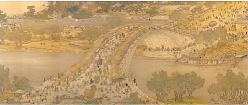 张卸货。横跨汴河上的是一座规模宏大的木质拱桥,结构精巧,形式优美,因状若飞虹,故名虹桥。有一只大船正待过桥,船夫们或用竹篙撑,或用长竹钩住桥梁,或用麻绳挽船,或忙着放下桅杆以顺利通过桥拱。邻船的人也指指点点像在大声吆喝着什么,桥上的人也伸头探脑紧张议论,期盼大船顺利通过。
