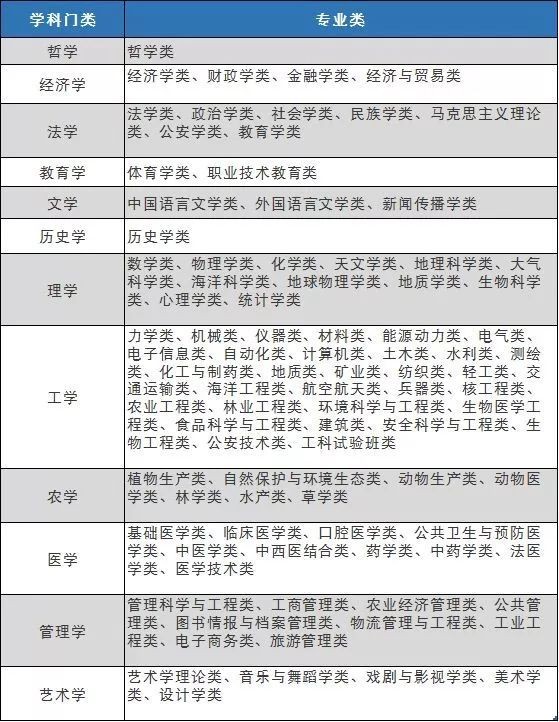 教育部《普通高等学校本科专业目录(2020年版)》。国务院学位委员会和教育部颁布修订的《学位授予和人才培养学科目录(2011年) 》,规定我国分为哲学、经济学、法学、教育学、文学、历史学、理学、工学、农学、医学、军事学、管理学、艺术学13个学科门类 。这12个学科门类下设有92个专业类。另外军事学学科门类,其代码11预留。高校将相同或相近学科门类合并(通常是同一个学院的专业),按一个专业大类招生,考生填报志愿不必具体到细分的若干专业,直接填报该大类名称即可。