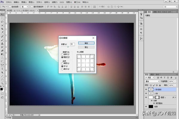 快捷键【Ctrl+J】将人物图层进行复制,得到“人物 副本”图层,为了制作动态效果,之后执行“滤镜—模糊—径向模糊”命令,在弹出来的对话框中设置相关的参数,之后单击“确定”按钮。如图所示: