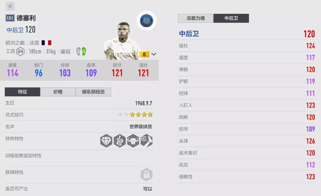 EBS德塞利的风格偏向于上抢,不过他又兼顾了不错的回防补位能力,比其他上抢型中卫的容错率更高,这样有利于提升防线的紧密度,对方就不容易从他这一侧找到突破空间,法国、切尔西和AC米兰套都建议入手使用。