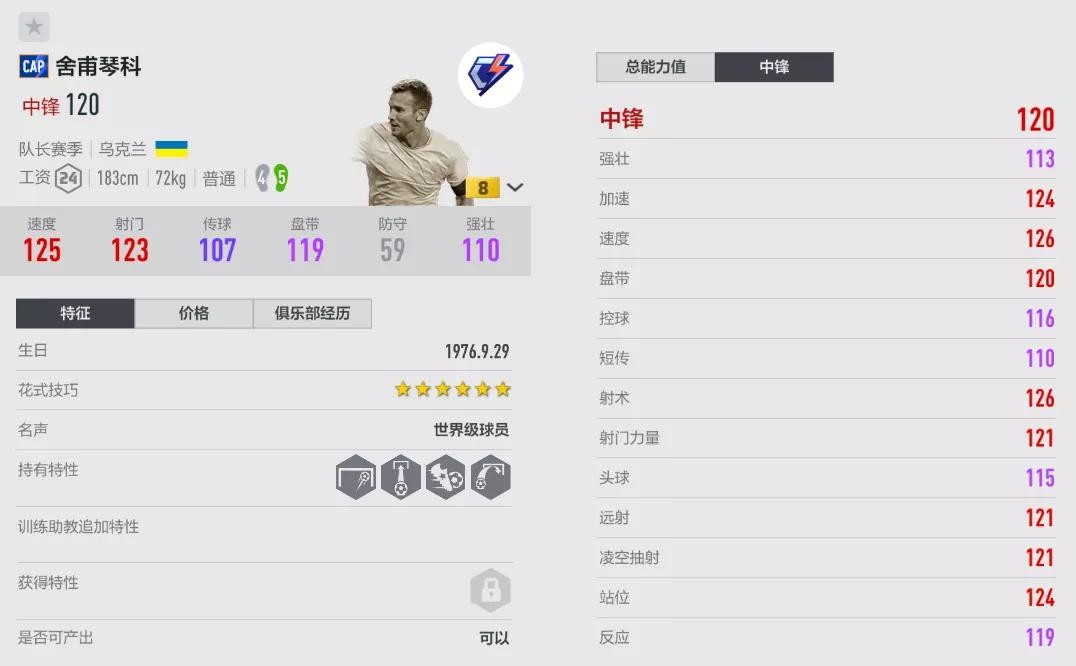 舍甫琴科在游戏里有多个赛季卡,初始巅峰为20WL赛季,不过综合考虑性价比和强度的话,CAP是目前最推荐使用的。CAP舍甫琴科的模型还是大家所熟悉的,183CM/72KG的比例让舍瓦具有比较高的灵活度;舍瓦的手感很柔和、对球的控制细腻,停球和接球转身比较流畅自然,不会有硬直感。