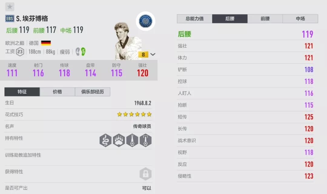 EBS是埃芬博格的巅峰赛季,和巴拉克相似,也是一名模型出众、攻防俱备的“六边形战士”。EBS赛季体型为“瘦弱”,这在大模型的基础上增加了一些柔和度,使得埃芬博格的手感不会过于笨重,做动作和摆脱也更有保障;EBS埃芬博格的参与度是“攻2守3”,在防守端的存在感会略高一些,所以更推荐作为后腰和中前卫使用,前腰的优先级稍微靠后。