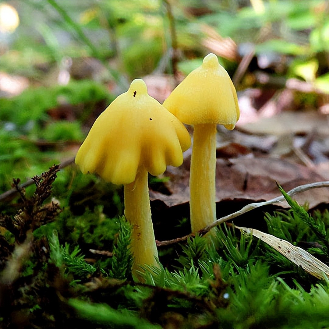 2.6 尖顶粉褶菌。中型偏小的软菇,有着漂亮的亮黄色菇体,菌盖外观像是一顶迷你的高级丝帽,帽顶突出个小扣钉,质感平滑而细腻。