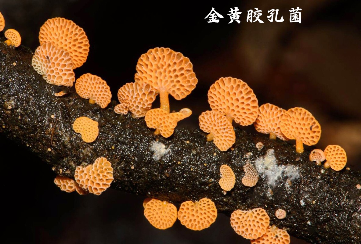 1.7 金黄胶孔菌。菇体是晶莹剔透的金黄色,背面有着又大又圆的菌孔,远远看就像珊瑚礁石,但摸起来和橡胶一样软而带点黏性,表面像被烫伤而冒出的水泡,很容易辨认。