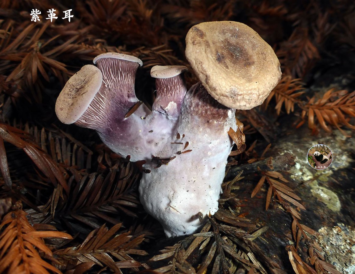 2.1 紫革耳,又叫光革耳。菌盖紫灰色, 扁平漏斗形至近圆形,侧生菌柄,质韧像皮革,故幼嫩可食,成熟时食用不宜。可入药用,散寒、舒筋、活络。