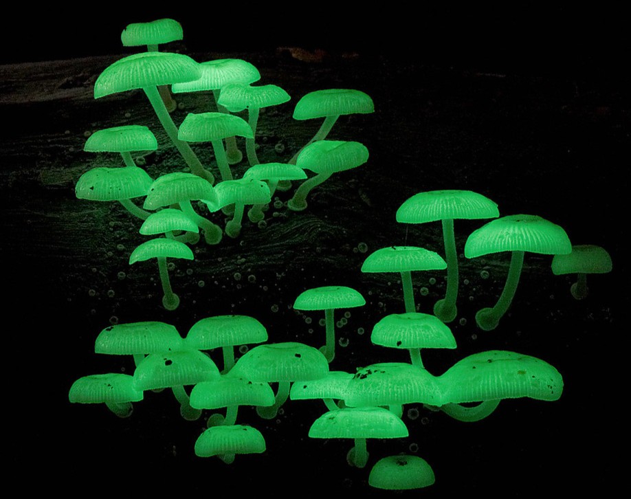 1.8 发光小菇。是一种古老的会发光的菌种。生长于东南亚地区,淡白褐色的菇体,钟形具沟纹的菌盖,白天容易与其他相似种混淆,但在夜间或放置黑暗中,菌褶则会有绿荧光。