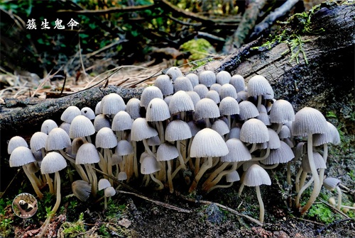 1.9 簇生鬼伞,又称“小钢盔”、“小仙女帽”。个头不大,常大面积聚生,相当壮观。菌盖初生时为乳白色,之后颜色转深,沟纹明显,看起来就像小仙女头上戴的帽子,但很快就会变成一滩黑水。可食用,但口味一般。