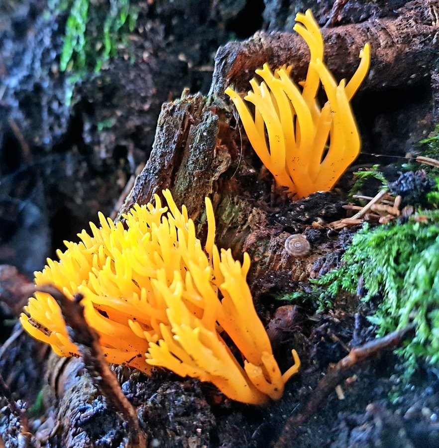3.3 黏胶角耳。小型橙色,珊瑚状分叉的菇体,摸起来黏黏的、有韧性。