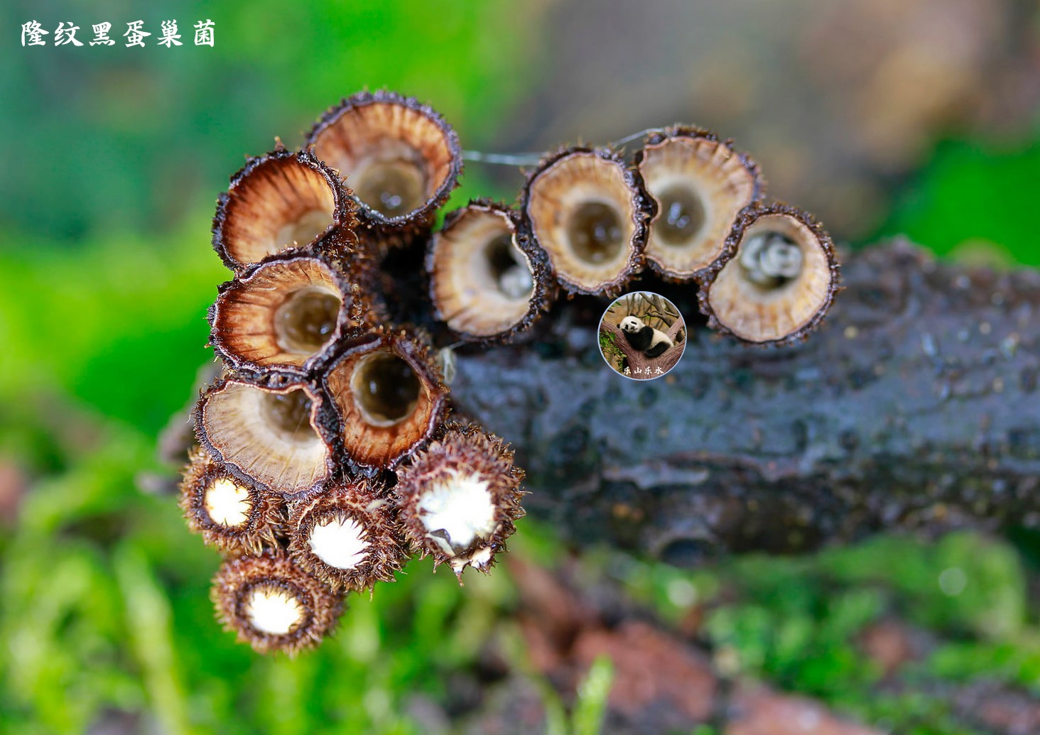 1.6 隆纹黑蛋巢菌。这种小型腹菌,形如其名,毛茸茸土褐色菇体如巢状,里面有一个个黑色的孢体,像一个盛满蛋壳的迷你鸟巢。可用于止胃痛。