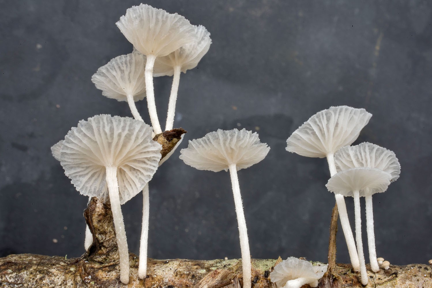 1.10 纯白微皮伞。物如其名,这种小野菇,纯白透明的菌盖,条纹不明显,状似张开降落伞,菌褶排列稀疏,非常奇特。