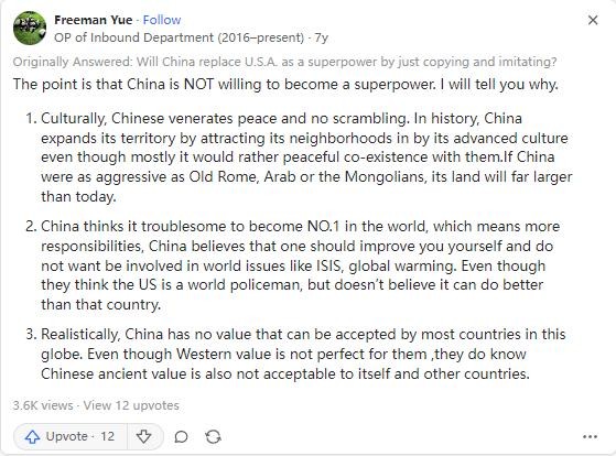 如果中国像古罗马、阿拉伯或蒙古人一样具有侵略性,其土地将比今天大得多,再者就是,中国认为成为世界第一很困难,这意味着更多的责任。