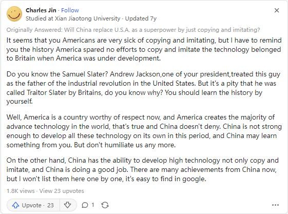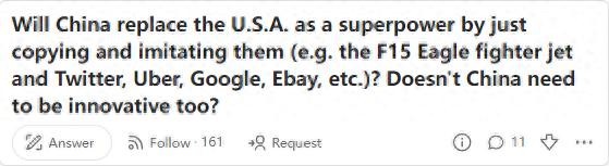 一位美国网友,他在国外最大的问答网站Quora上提出了一个问题:“中国真的会创新吗,他们是否只会复制模仿美国的尖端科技?”当看到这个问题后,我也是无语了,简直是妥妥的美式傲慢。