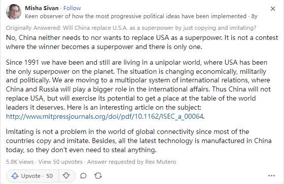 我们应该知道,历史总是在变化,科技在不断进步,模仿他人永远无法停止,也许中国会成为下一个超级大国,谁知道呢?反正现阶段中国根本没有超越美国的想法。