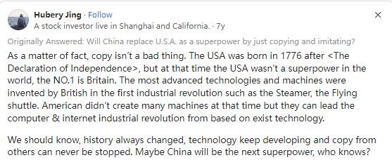 紧接着来自中国的网友评论道,似乎你们美国人非常讨厌抄袭和模仿,但我必须提醒你们,在美国发展时期,美国也曾不遗余力地抄袭和模仿属于英国的技术。