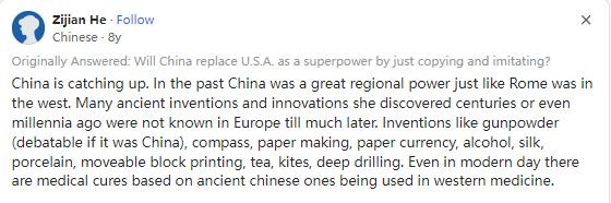 随后来自新西兰的网友评论道,中国正在迎头赶上,就像西方的罗马一样,中国在古代有着很多发明和创新,这些发明在几个世纪甚至几千年前被中国研发出来。