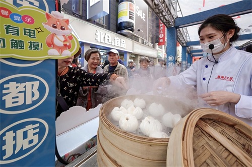 “饮啖茶,吃个包”这句话道出了老广叹茶的经典搭配,其中“开口笑”叉烧包更是茶桌上的必备之选,被誉为粤点四大天王中的“粤点之母”。活动现场,叉烧包凭借其独特口感俘获了市民游客的心。叉烧包面皮松软且有弹性,馅料满满、鲜嫩多汁、咸甜交织,令人回味无穷。