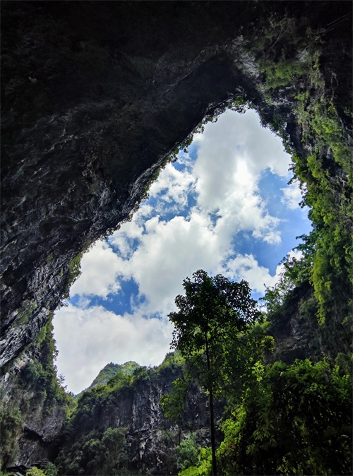 百魔洞内的天坑非常奇特,天坑上面是悬崖,崖上有人家。