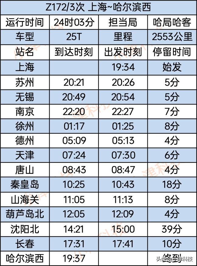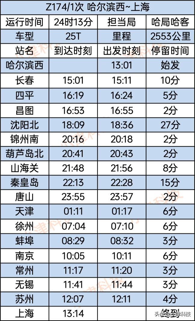 哈尔滨西站至上海站Z174/171次运行24小时13分,哈尔滨西、长春、四平、昌图、沈阳北、锦州南、葫芦岛北、山海关、秦皇岛、唐山、天津、徐州、蚌埠、南京、常州、无锡、苏州、上海。