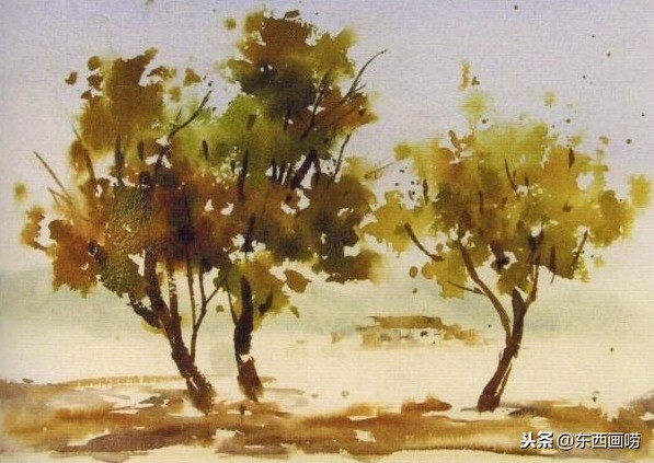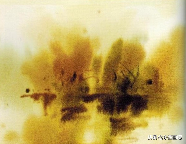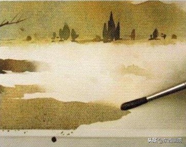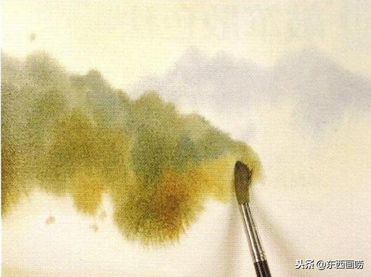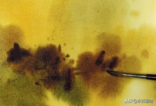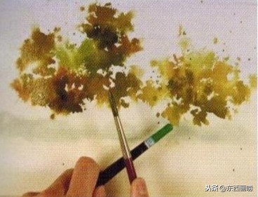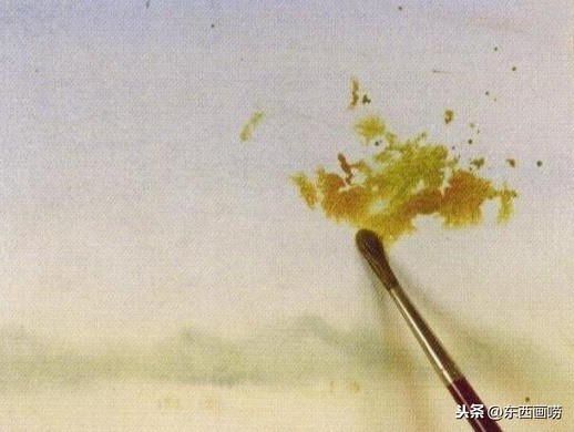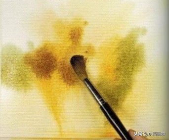 待全干后,用清水在树丛的范围内任意挥洒,再用黄赭、红赭与树绿画树丛。