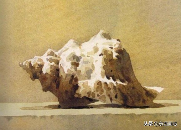 将镉橙、黄赭、钴蓝稀释调和后,大笔挥洒贝壳亮面以外的区域。