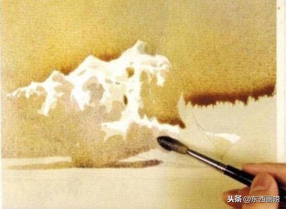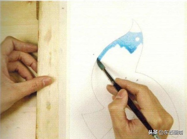 用左手托高左侧的画板,从抹水处接着往下游(指水的流向)接色。