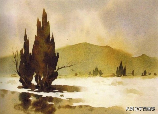 在底色即将完成干燥前,及时画出前景的枯树,即可完成,
