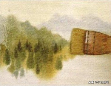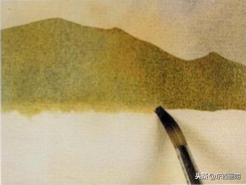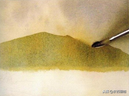稍待1-2分钟,再用洗净的笔尖将山的下缘柔化。