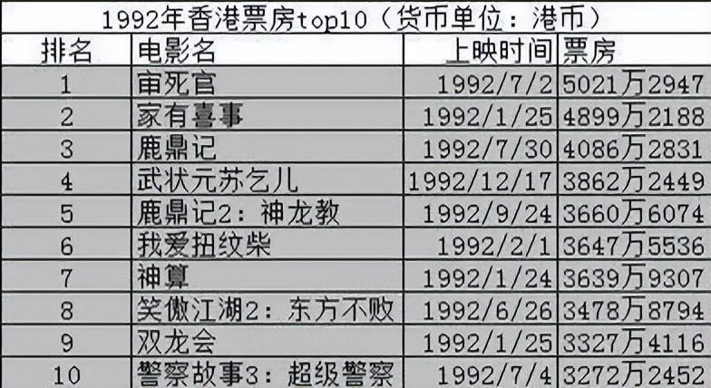 1992年,香港票房前十,周星驰独占半壁江山,包揽前五。