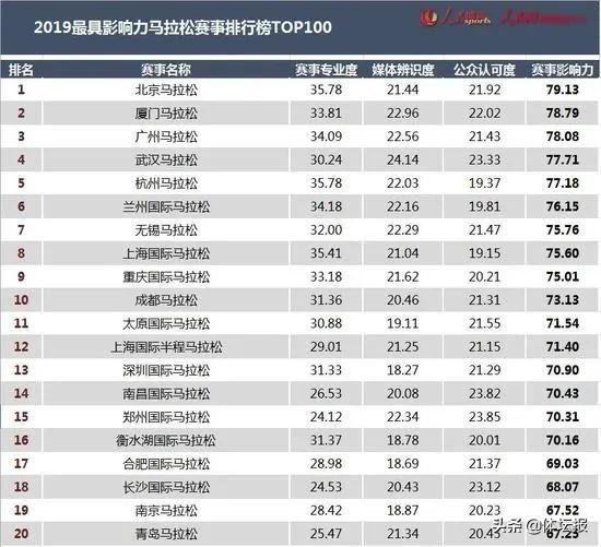 4月7日,“2019年最具影响力马拉松赛事排行榜”Top100赛事出炉,北京马拉松、厦门马拉松、广州马拉松分列前三位。