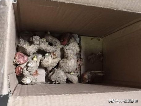 第二种是将刚买回来的姜,放地上稍微晾干一下,如果你买回来的是人家已经晾干的,直接忽略这一步;晾干之后,找一个小纸箱,把这些姜全部放进去,盖好纸箱盖,不用透明胶密封,留条缝,随用随拿,记住拿完之后盖上纸箱盖就行了。