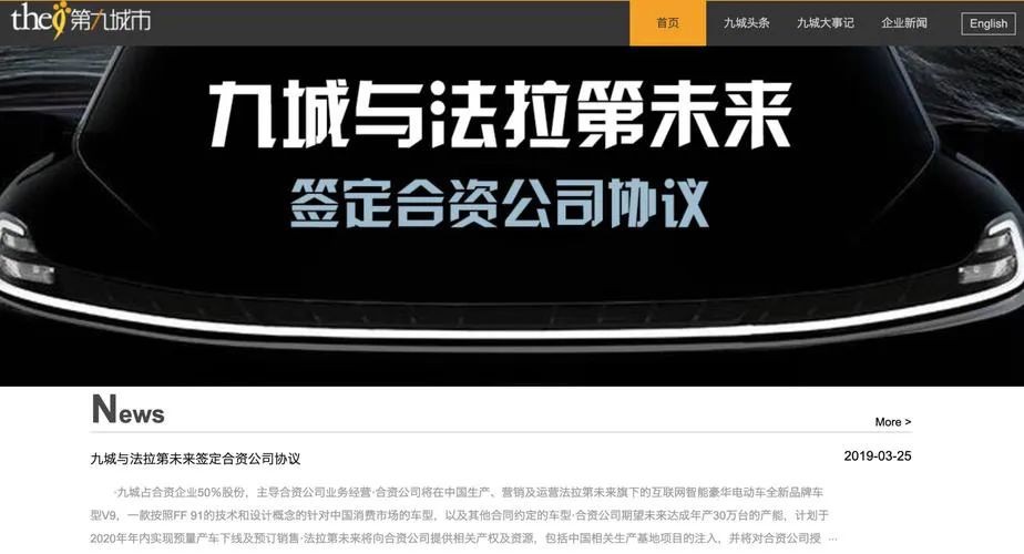 作为一家游戏开发公司,九城虽然2004年就在美国上市,但截至2019年3月,这家公司市值已经缩水至1.1亿美元,其网页宣传内容当时早已没有任何游戏业务,介绍显示九城“现阶段主要集中于区块链相关业务”。根据合资公司协议条款,九城将以三个等额分期向合资公司注资最高达6 亿美元。FF 将向合资公司提供相关产权及资源,包括在中国的土地使用权作为生产基地,并将对合资公司授予包括法拉第未来全新品牌车型 V9 及其他指定车型在中国的独家生产、营销及销售权。双方合作的重要前提是“均在相关条件满足后注入资金和产权资源”。