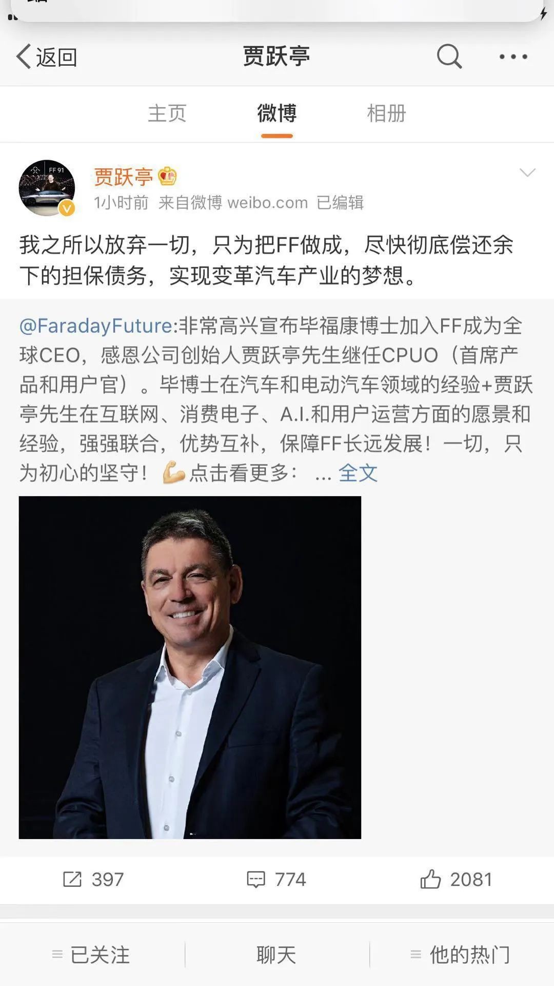 贾跃亭用这张照片变相回应韬蕴资本自己没有躲起来