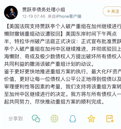 10月17日,尽管懒才资产向美国特拉华州破产法院申请驳回贾跃亭个人破产申请,试图重启加州法院对贾跃亭资产的审查程序,并表示贾跃亭破产重组动机出于恶意,但美国对债务人更“友好”的法律条文,既不会对贾跃亭与FF采取任何消费限制或经济制裁,也更支持贾跃亭的破产重组计划。