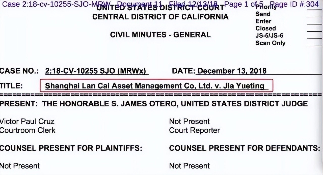 2018年12月13日,美国加州中区法院文书显示,“上海懒财资产管理有限公司”(以下简称“懒财资产”)向法院提请冻结贾跃亭在美资产。“懒财资产”表示,2016年12月2日,乐视体育文化产业发展(北京)有限公司(以下简称“乐视体育”)向“懒财资产”借款5000万元,并协定12月内一次性偿还本金,贾跃亭本人和乐视控股作为担保人应负连带责任。“懒财资产”律师称,为防止贾跃亭转让资产,因此提请对相关资产进行冻结。申请冻结的资产包括贾跃亭持有的FF股份(占FF总股本的33%)以及贾跃亭通过壳公司拥有的加州豪宅。