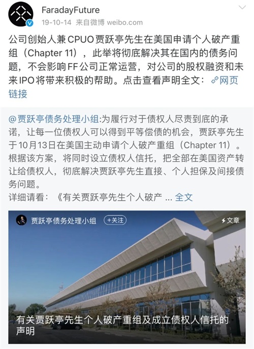 2019年10月13日,贾跃亭宣布在美国主动申请个人破产重组,将其个人债务与所持FF股权正式绑定。根据破产重组文件,贾跃亭将把美国法院认可的全部个人资产即个人持有的全部FF股权及相关收益权正式转入债权人信托中。事实上,贾跃亭将FF所持40.8%股份转让给侄子Ruokun Jia,在间接掌控FF同时扫清了FF与贾跃亭债务制裁的问题。截止2019年10月13日,贾跃亭宣布已偿还债务30亿美元,待偿还债务36亿美元,减去国内已冻结待处置的资产以及可转股担保债务,债务净额20亿美元。破产重组文件披露,FF计划在2020年1月前完成B轮8.5亿美元融资,届时估值将达到50亿美元。规划中,FF将在2021年完成IPO,届时估值将达100-210亿美元。
