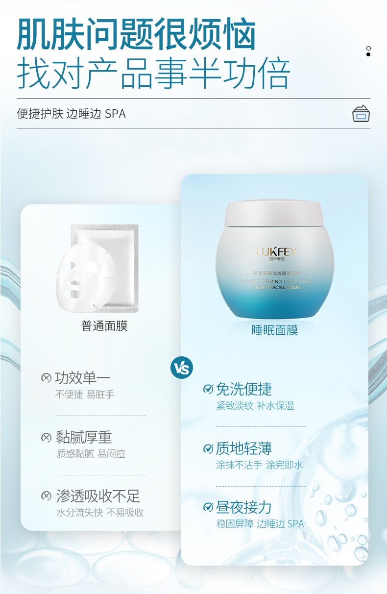 当夜幕降临,露卡菲娅免洗睡眠面膜悄然开启你肌肤的修复之旅。它无需冲洗,一抹即睡,在你沉睡时施展魔法,用丰富的营养成分滋养每一寸肌肤,修复受损的细胞,让你在晨曦中醒来,迎接的是宛如新生般的细腻与光泽。坚持使用露卡菲娅这款免洗睡眠面膜,让每个夜晚都成为肌肤的美丽重生。